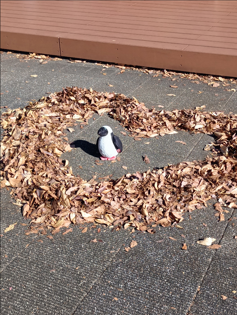散策中には、落ち葉で作られたハートの中にペンギンの置物が立っている可愛いスポットも発見し、つい写真を一枚(笑)。